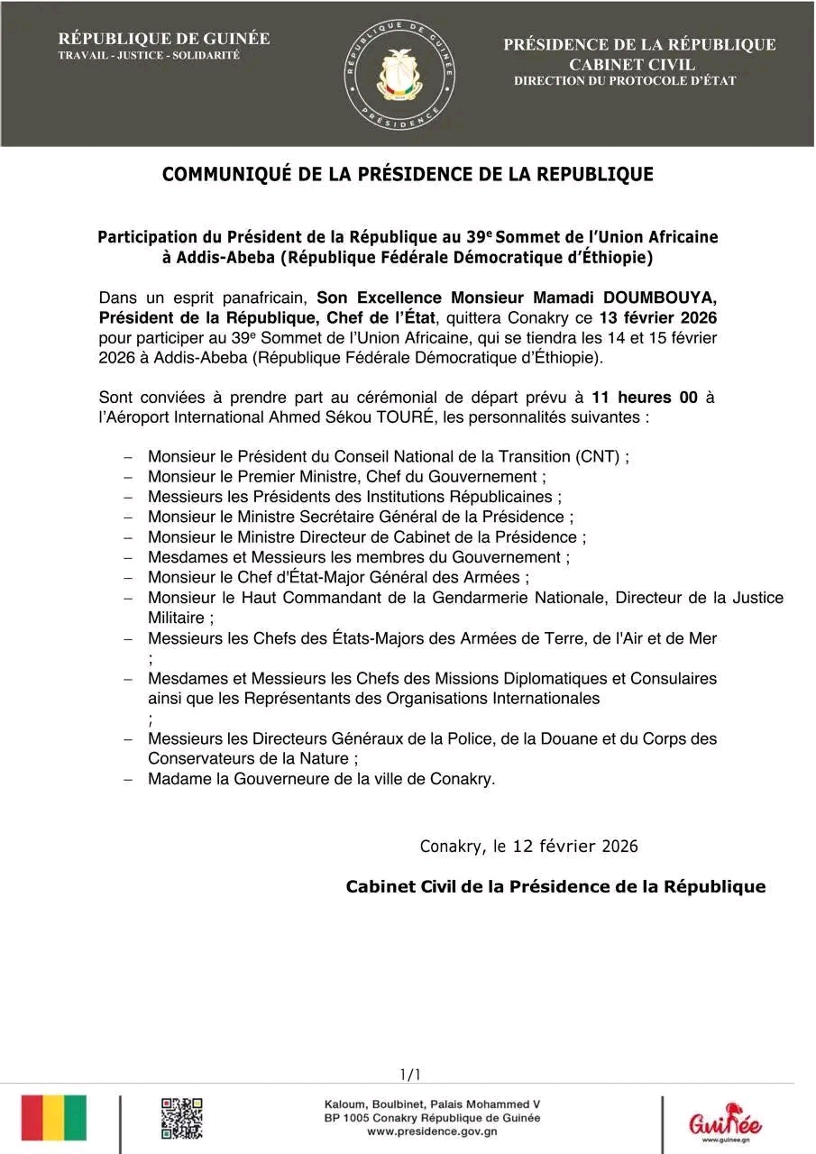Le président de la République Mamadi Doumbouya quittera Conakry ce 13 février 2026 pour participer au 39ème Sommet de l’Union Africaine, qui se tiendra les 14 et 15 février 2026 à Addis-Abeba (République Fédérale Démocratique d’Éthiopie). Le chef de l’État quittera la capitale guinéenne à 11h GMT.