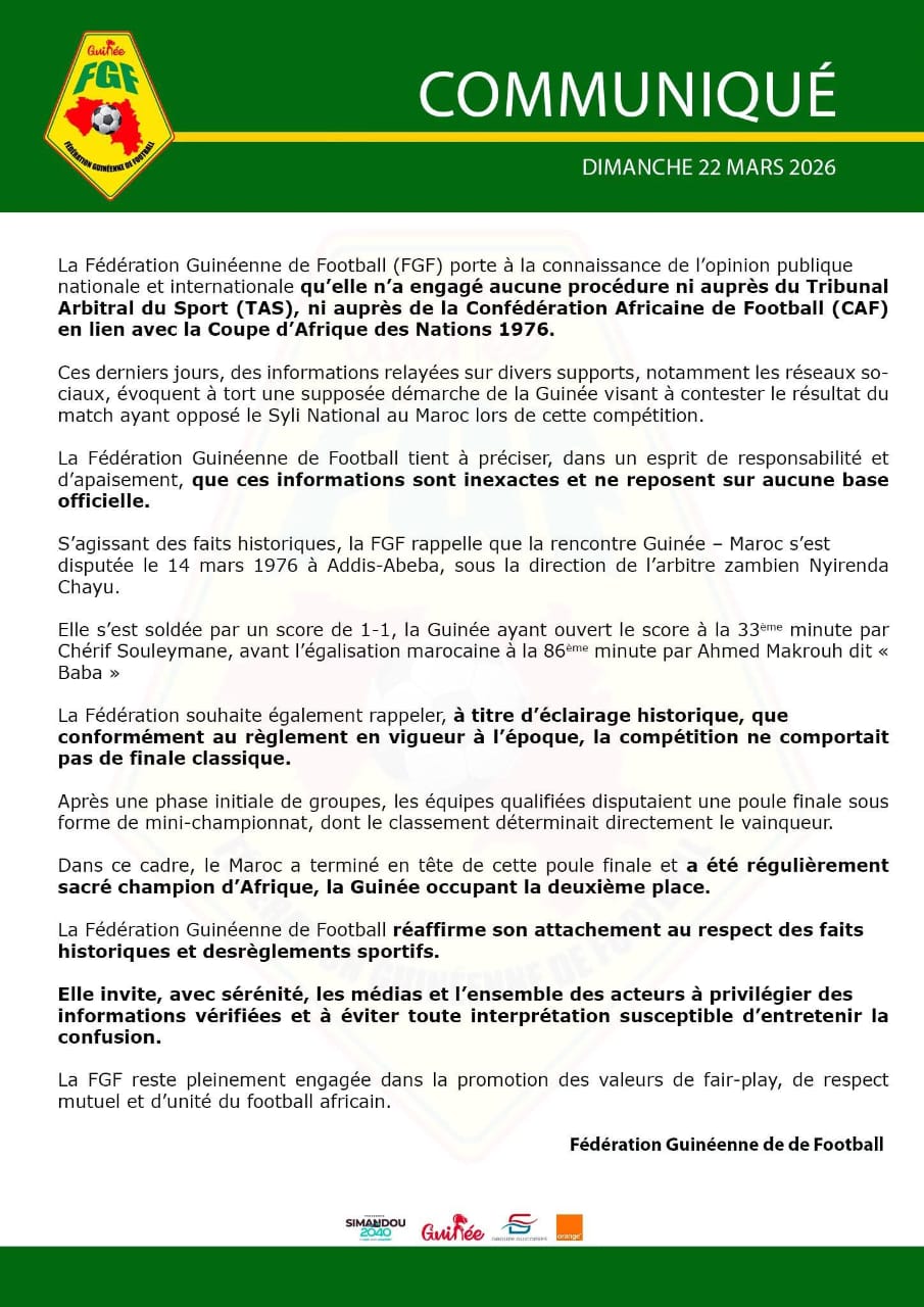La Fédération guinéenne de Football (FGF) a dans un communiqué démenti la rumeur qui circulait d’une éventuelle contestation de la coupe d’Afrique des Nations de 1976. Selon elle, la n’a engagé aucune procédure ni auprès du Tribunal Arbitral du Sport (TAS), ni auprès de la Confédération Africaine de Football (CAF) en lien avec la Coupe d’Afrique des Nations 1976”.