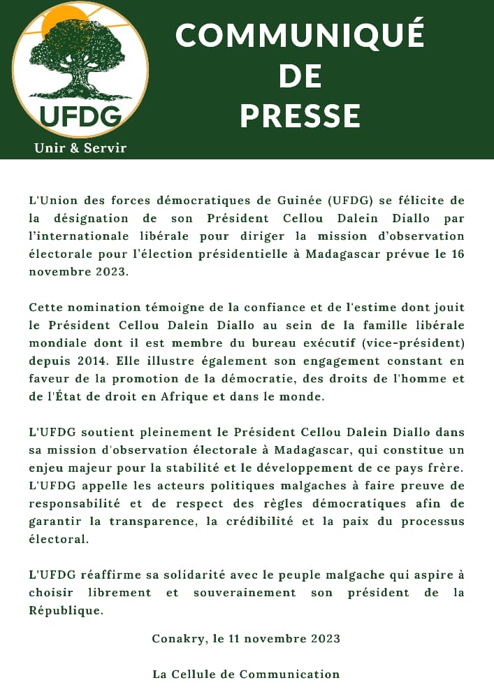 L’Union des forces démocratiques de Guinée (UFDG) se félicite de la désignation de son Président Cellou Dalein Diallo par l’internationale libérale pour diriger la mission d’observation électorale pour l’élection présidentielle à Madagascar prévue le 16 novembre 2023.