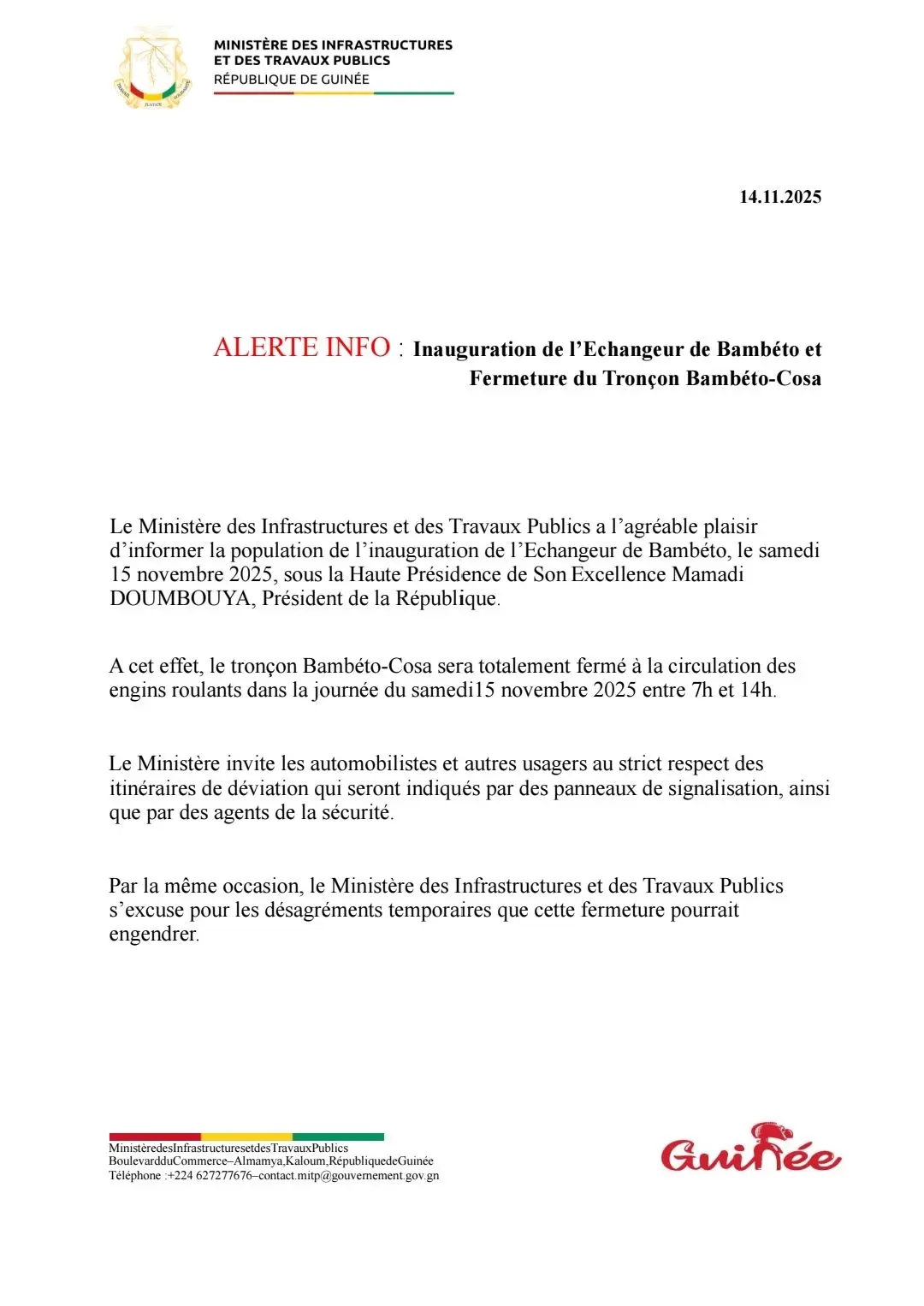 L’échangeur de Bambeto sera inauguré ce samedi 15 novembre 2025. A cette occasion, le ministère des Infrastructures et des Travaux Publics annonce que le tronçon Bambéto-Cosa sera totalement fermé à la circulation des engins roulants dans la journée de ce samedi entre 7h et 14h.