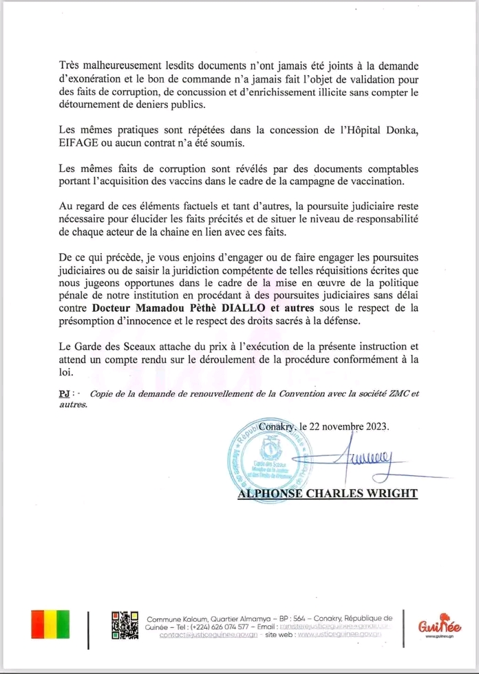 Quelques heures après son limogeage du gouvernement, Mamadou Pèthè Diallo, est dans le collimateur de la justice guinéenne. Ce mercredi 22 novembre 2023, le ministre de la justice garde des seaux, a fait des injonctions au procureur général près la Cour d’appel de Conakry de faire ouvrir une enquête contre l’ancien ministre de la santé et plusieurs autres.