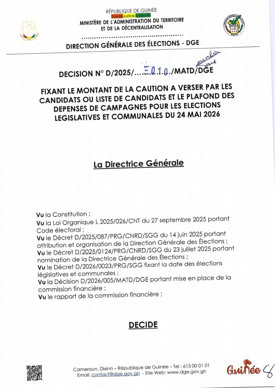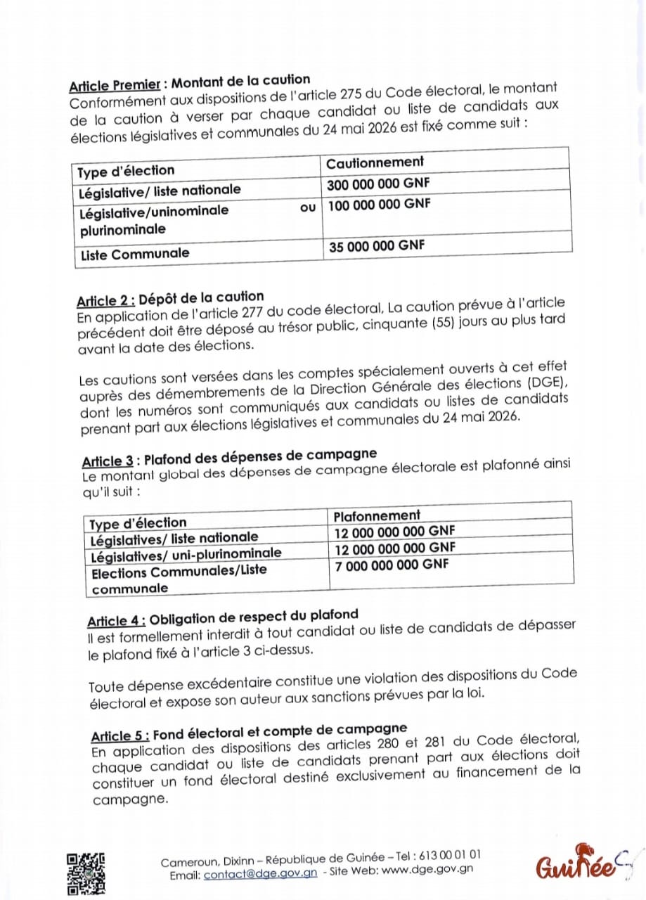 En vue des élections législatives et communales prévues le 24 mai prochain, la Direction générale des élections (DGE) a fixé les montants de la caution pour la participation aux deux scrutins. La DGE a décidé que ces montants sont établis comme suit : pour la liste communale, 35 000 000 GNF ; pour la liste législative (uninominale et plurinominale), 100 000 000 GNF ; et pour la liste nationale, 300 000 000 GNF.