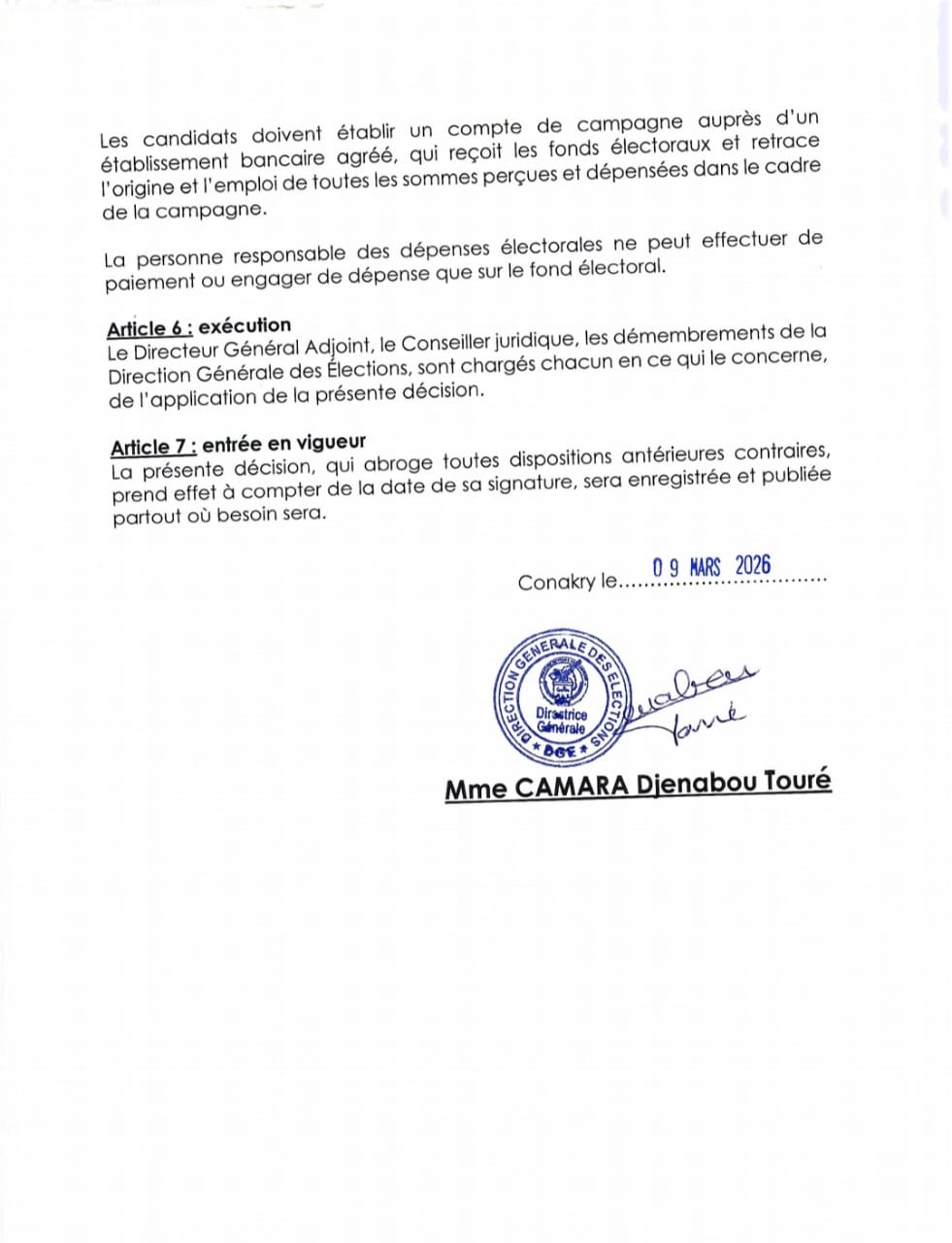 Par ailleurs, les plafonds des dépenses de campagne sont fixés comme suit : liste nationale, 12 000 000 000 GNF ; liste uninominale/plurinominale, 12 000 000 000 GNF ; et liste communale, 7 000 000 000 GNF.
