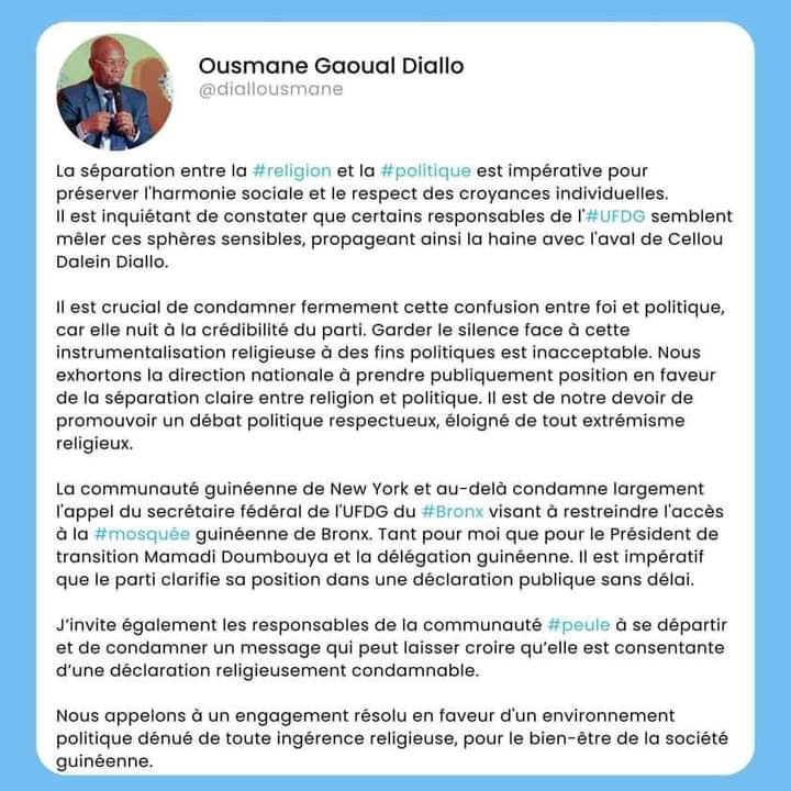 Dans un post sur Facebook, Ousmane Gaoual Diallo, ministre porte-parole du gouvernement de la transition a invité l’UFDG à condamner cette sortie.
