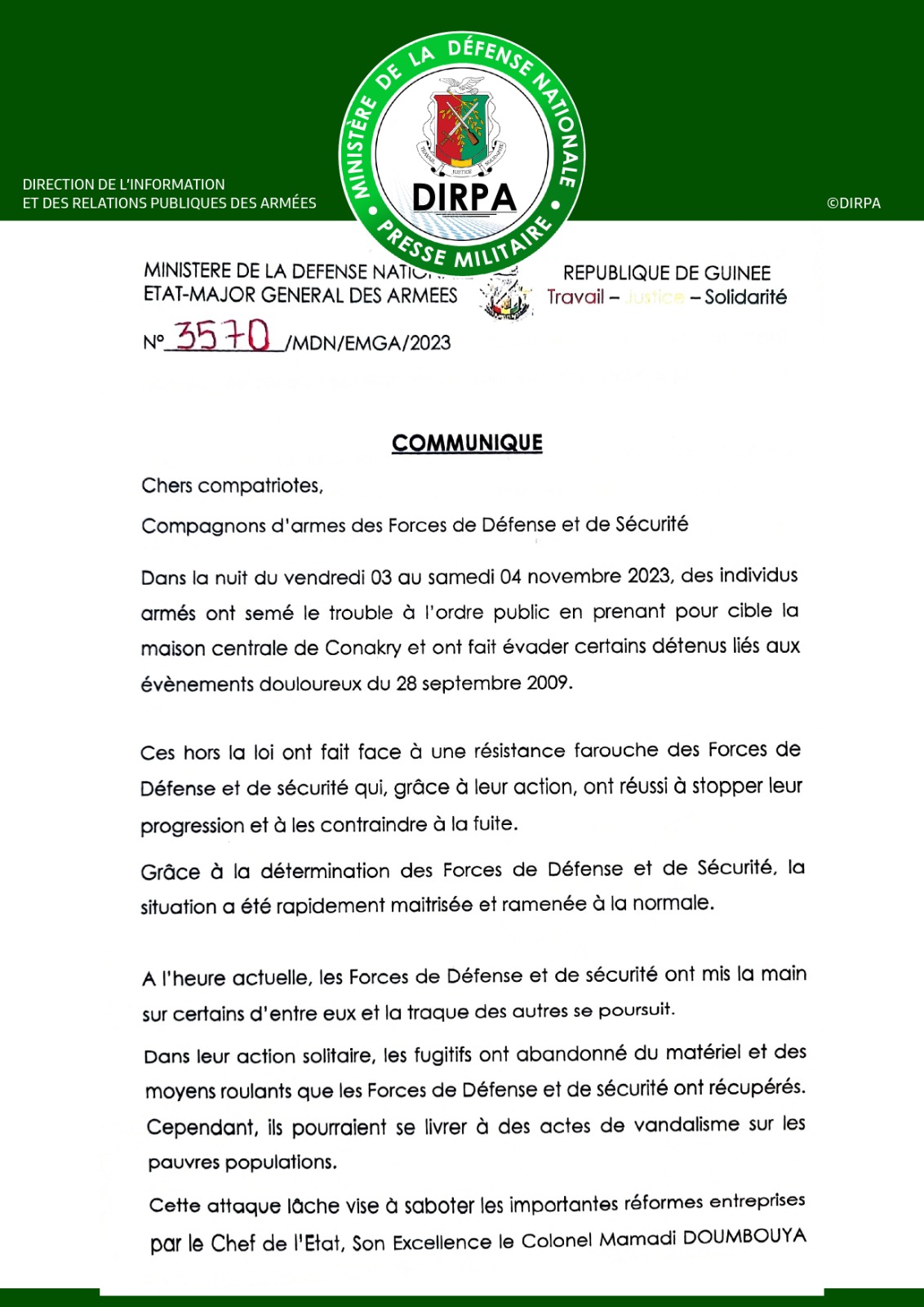 Dans la nuit du vendredi 03 au samedi 04 novembre 2023, des individus armés ont semé le trouble à l’ordre public en prenant pour cible la maison centrale de Conakry et ont fait évader certains détenus liés aux évènements douloureux du 28 septembre 2009.