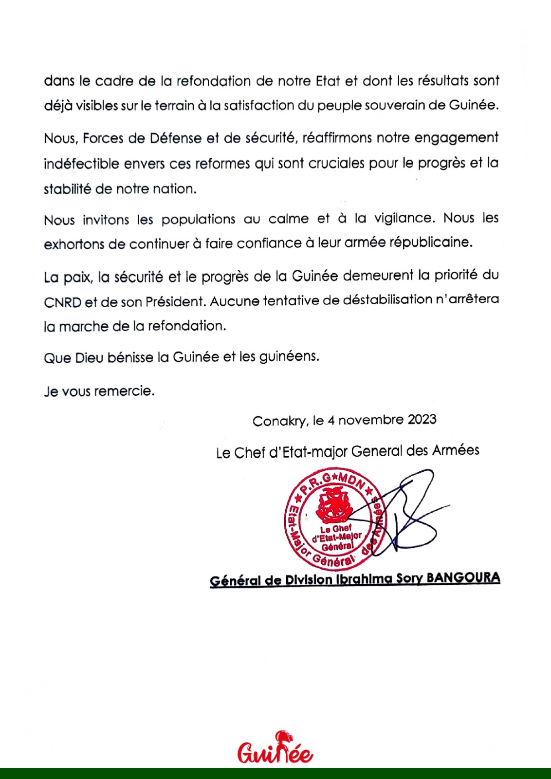 La paix, la sécurité et le progrès de la Guinée demeurent la priorité du CNRD et de son Président. Aucune tentative de déstabilisation n’arrêtera