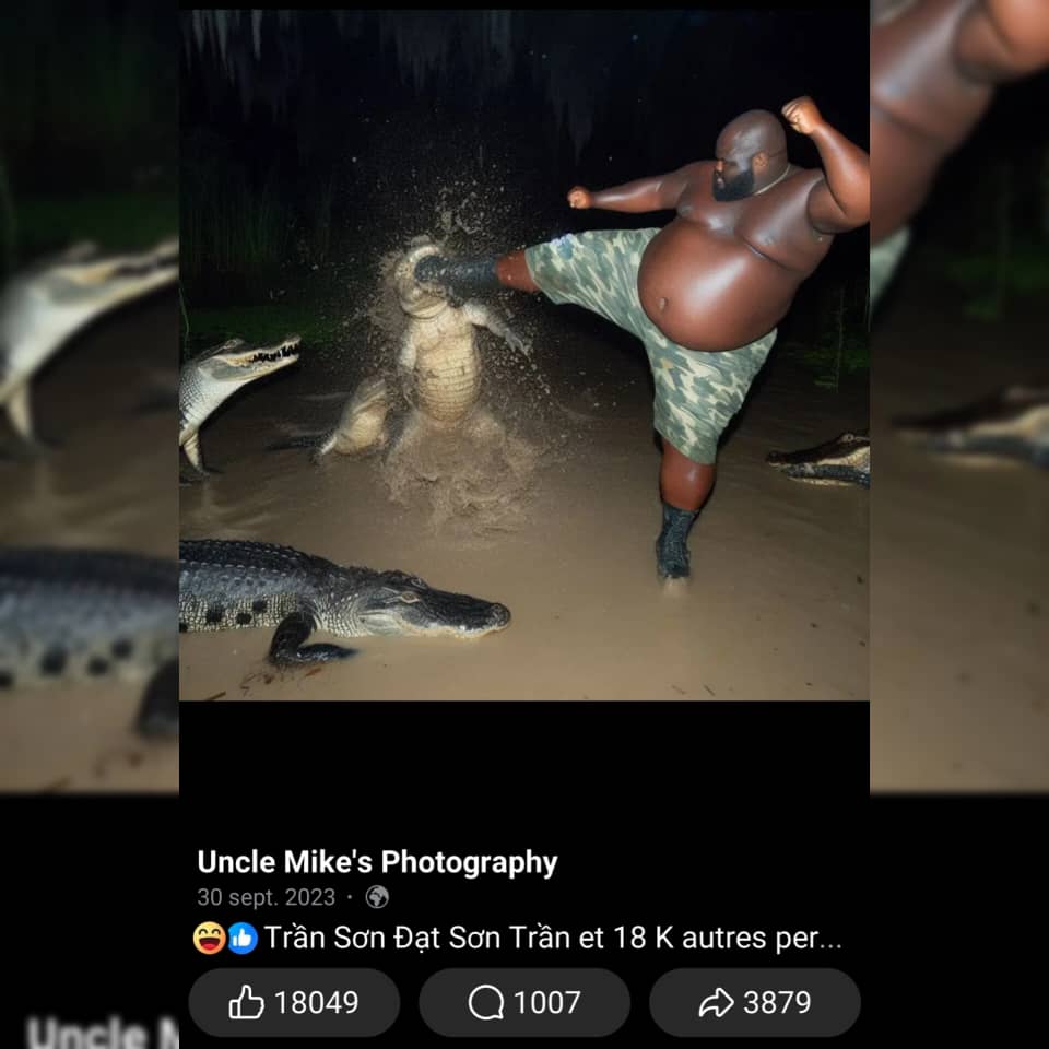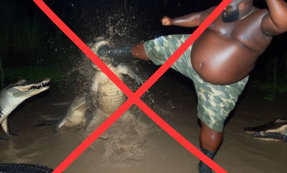 Suite aux vérifications effectuées par la rédaction de woulanews.com, nous sommes en mesure d’affirmer que l’image virale de l’homme torse nu donnant un coup de pied à un alligator qui circule sur les réseaux sociaux n’est pas réelle. Elle a été générée par une intelligence artificielle (IA). Autrement dit, par un logiciel.