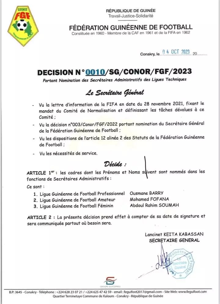 La décision concerne les secrétaire généraux de la Ligue Guinéenne de Football Professionnel, la Ligue Guinéenne de Football Amateur et Ligue Guinéenne de Football Féminin. Ci-dessous la décision.
