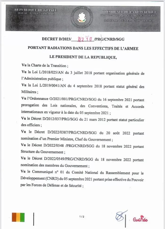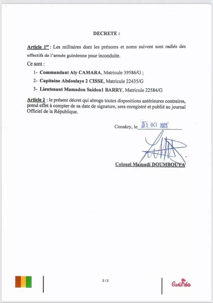 Selon le décret ci-dessous, ces trois militaires sont radié de l’effectif de l’armée guinéenne pour « des faits d’inconduite ».