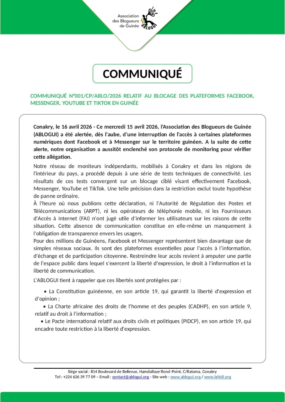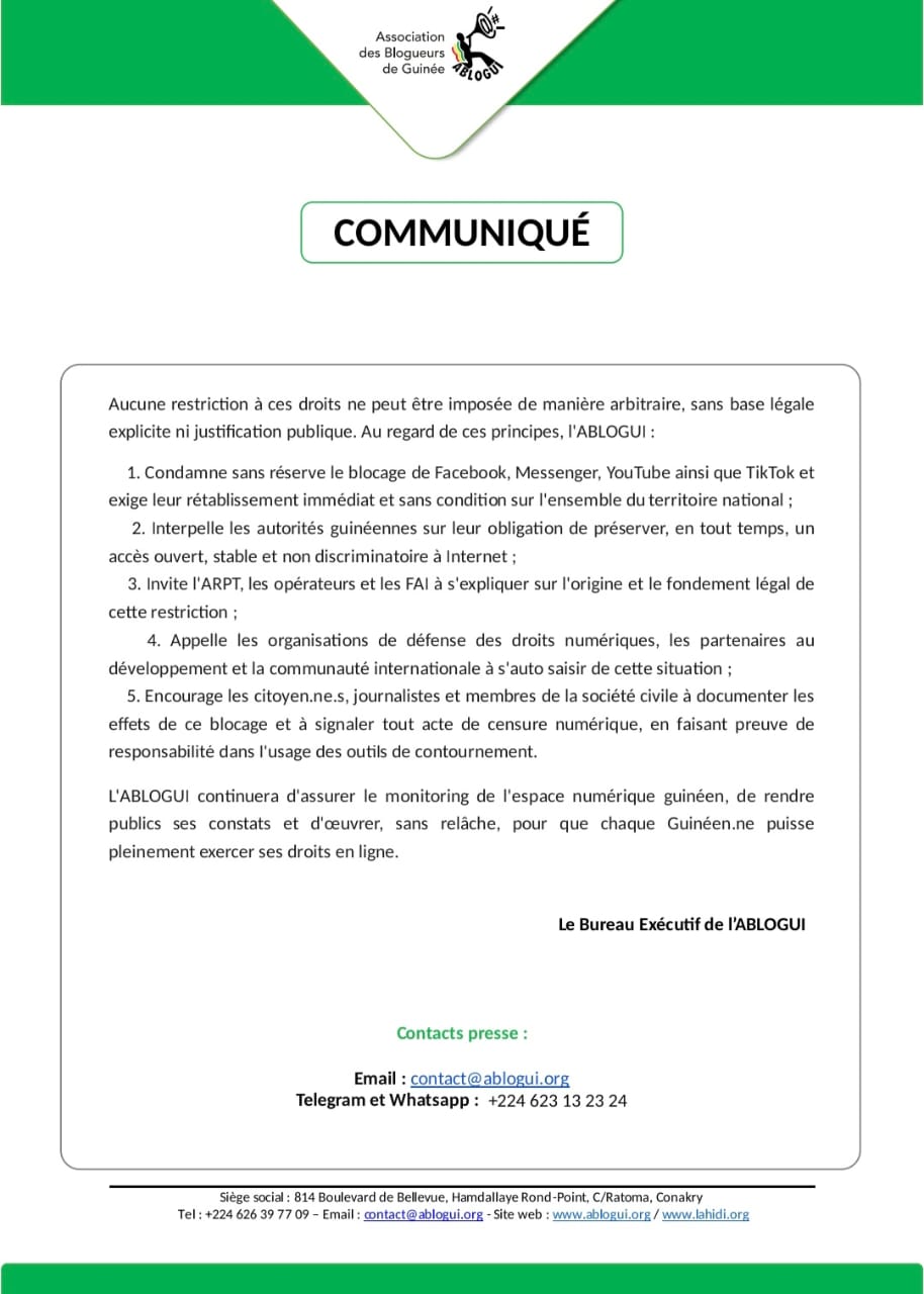 Au nom de ses principes, ABLOGUI « condamne sans réserve le blocage de Facebook, Messenger, YouTube ainsi que TikTok, et exige leur rétablissement immédiat et sans condition sur l’ensemble du territoire national ; interpelle les autorités guinéennes sur leur obligation de préserver, en tout temps, un accès ouvert, stable et non discriminatoire à Internet ; invite l’ARPT, les opérateurs et les FAI à s’expliquer sur l’origine et le fondement légal de cette restriction ; appelle les organisations de défense des droits numériques, les partenaires au développement et la communauté internationale à se saisir de cette situation ; encourage les citoyen·ne·s, journalistes et membres de la société civile à documenter les effets de ce blocage et à signaler tout acte de censure numérique, en faisant preuve de responsabilité dans l’usage des outils de contournement ».