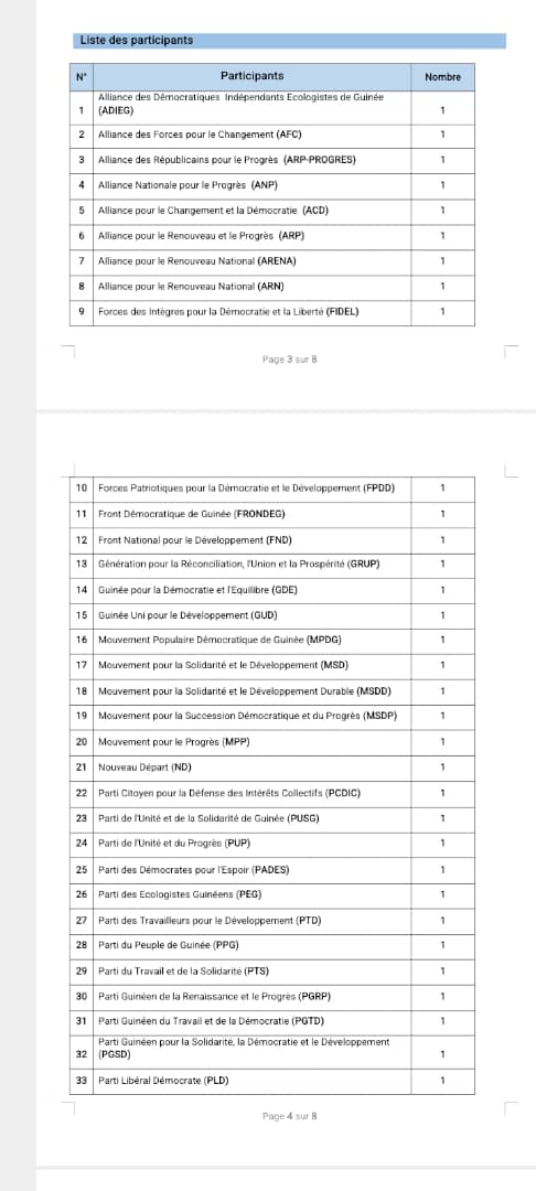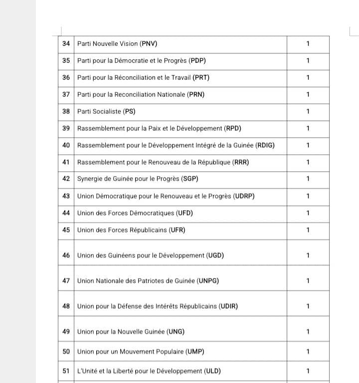 Ce sont au total 51 nouveaux partis politiques ont officiellement été certifiés par le ministère de l’Administration du Territoire et de la Décentralisation (MATD). Désormais en Guinée, 125 partis politiques sont aptes à évoluer sur l’ensemble du territoire national. Ci-dessous la liste des nouvelles formations politiques autorisées.
