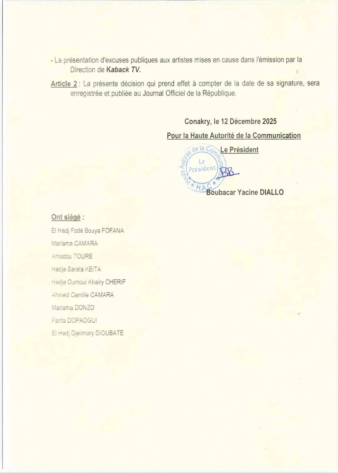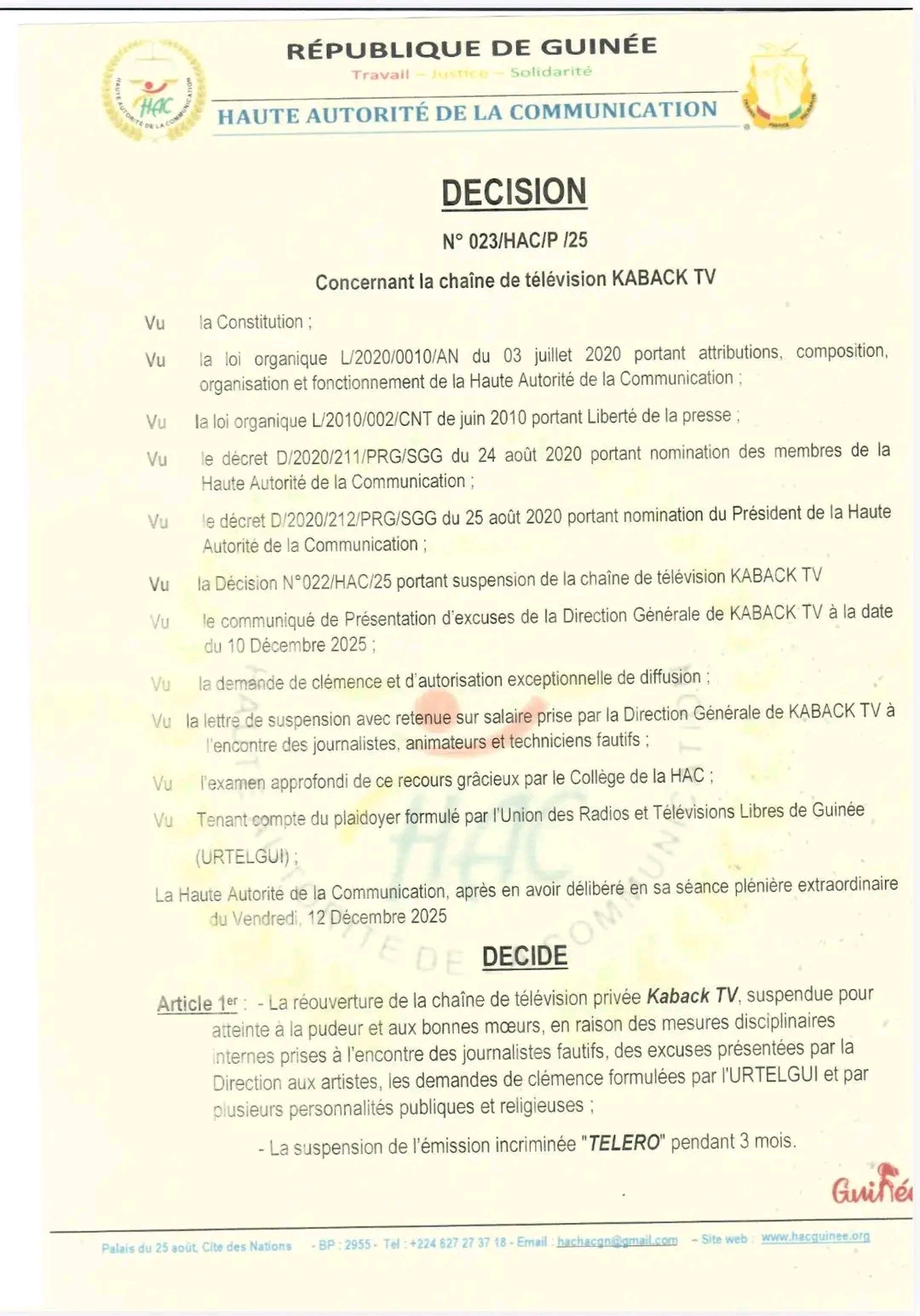 La Haute autorité de la communication autorise la réouverture de la chaîne de télévision privée Kaback TV, suspendue pour atteinte à la pudeur et aux bonnes mœurs, en raison des mesures disciplinaires internes prises à l’encontre des journalistes fautifs, des excuses présentées par la Direction aux artistes, les demandes de clémence formulées par l’URTELGUI et par plusieurs personnalités publiques et religieuses.