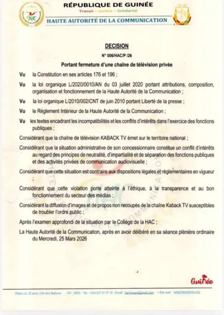 Dans une décision prise, mercredi 25 mars 2026, la haute autorité de la communication (HAC) a ordonné la fermeture de la chaîne de télévision privée Kaback TV. La décision est prise à l’issue plénière qui réunit 11 commissaires de la HAC.