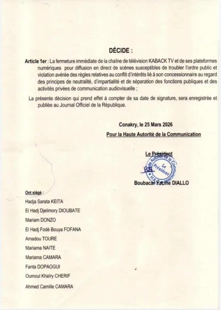 “La fermeture immédiate de la chaîne de télévision KABACK TV et de ses plateforme numériques pour diffusion en direct de scènes susceptibles de troubler l’ordre public et violation avérée des règles relatives au conflit d’intérêts lié à son concessionnaire au regard des principes de neutralité, d’impartialité et de séparation des fonctions publiques et des activités privées de communication audiovisuelle”, lit-on dans la décision ci-dessous.