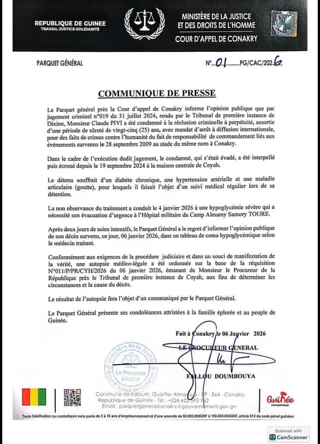 Le Parquet général près la Cour d’appel de Conakry informe l’opinion publique que par jugement criminel nº019 du 31 juillet 2024, rendu par le Tribunal de première instance de Dixinn, Monsieur Claude PIVI a été condamné à la réclusion criminelle à perpétuité, assortie d’une période de sûreté de vingt-cinq (25) ans, avec mandat d’arrêt à diffusion internationale, pour des faits de crimes contre l’humanité du fait de responsabilité de commandement liés aux événements survenus le 28 septembre 2009 au stade du même nom à Conakry.