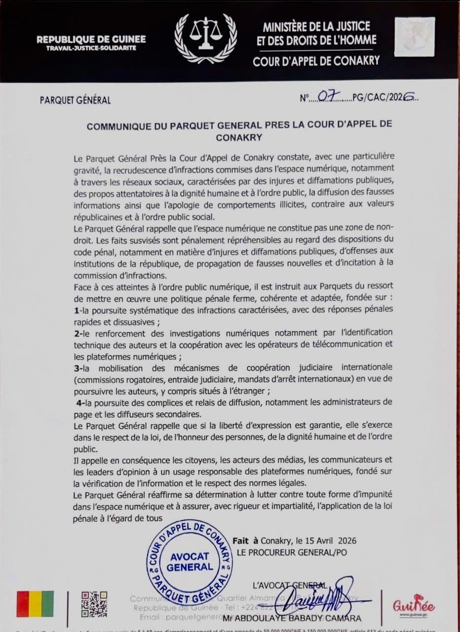 Les récentes tensions sur les réseaux sociaux en Guinée ont attiré l’attention du Parquet Général près la Cour d’appel de Conakry. Dans un communiqué, il a exprimé une vive inquiétude face à la multiplication des infractions numériques, incluant injures, diffamations, et propagation de fausses informations, souvent portant atteinte à la dignité humaine et à l’ordre public. Le parquet souligne que ces actes ne relèvent pas de la liberté d’expression, mais sont des infractions pénales passibles de sanctions sévères selon le code pénal guinéen.