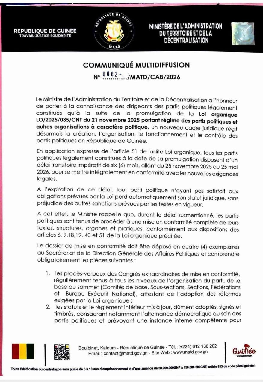 Selon le communiqué, qui indique que de l’article 51 de ladite loi organique stipule que tous les partis politiques légalement constitués à la date de sa promulgation disposent d’un délai transitoire impératif de six (6) mois, allant du 25 novembre 2025 au 25 mai 2026, pour se mettre intégralement en conformité avec les nouvelles exigence légales.