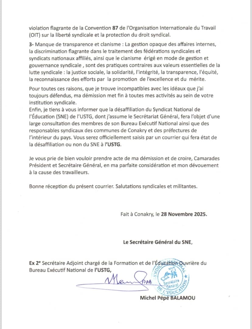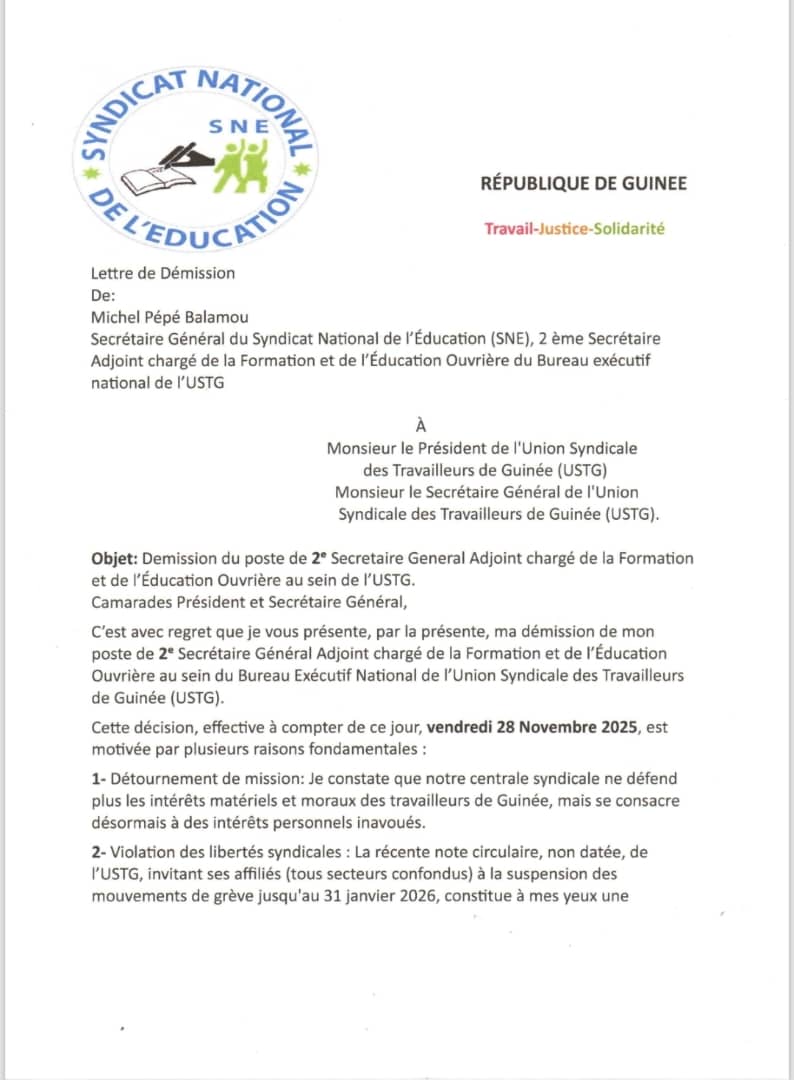Michel Pépé Balamou secrétaire général du syndicat national de l’éducation (SNE) claque la porte du de l’union syndicale des travailleurs de Guinée (USTG). Il accuse cette centrale d’avoir violé les libertés syndicales, manque de transparence et de clanisme entre autres…