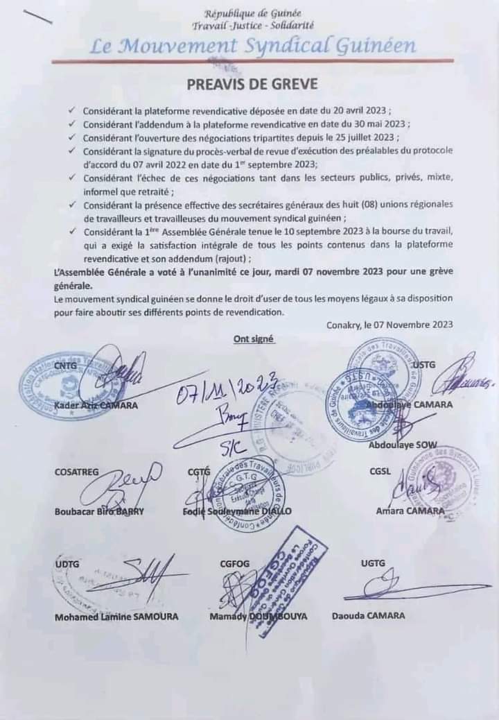 Le mouvement syndical guinéen décide d’appuyer sur l’accélérateur face à l’État. A la sortie d’une d’une assemblée générale extraordinaire, ce mardi 7 novembre 2023 à Conakry, les syndicalistes ont annoncé avoir déposé un préavis de grève au près des autorités.