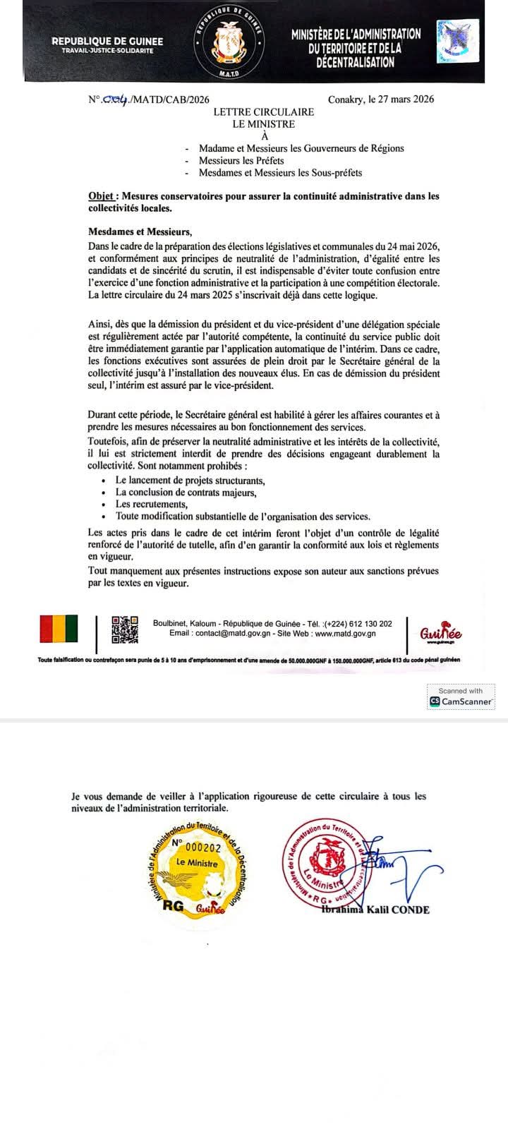 Plusieurs membres des délégations spéciales de Conakry ont démissionné, provoquant une réorganisation administrative. Dans une circulaire du 27 mars 2026, le ministère de l’Administration du territoire ordonne aux secrétaires généraux d’assurer l’intérim. Ils garantiront la continuité du service public jusqu’à l’installation de nouveaux responsables élus, selon les dispositions en vigueur.