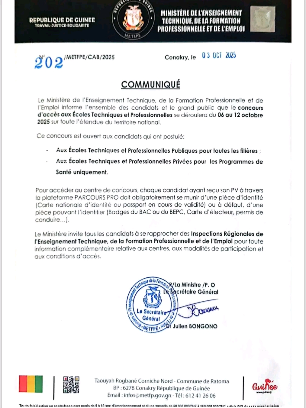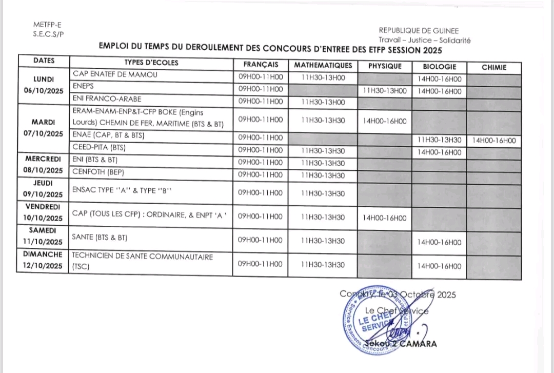 Le Ministère de l’Enseignement Technique, de la Formation Professionnelle et de l’Emploi informe l’ensemble des candidats et le grand public que le concours d’accès aux Écoles Techniques et Professionnelles se déroulera du 06 au 12 octobre 2025 sur toute l’étendue du territoire national.