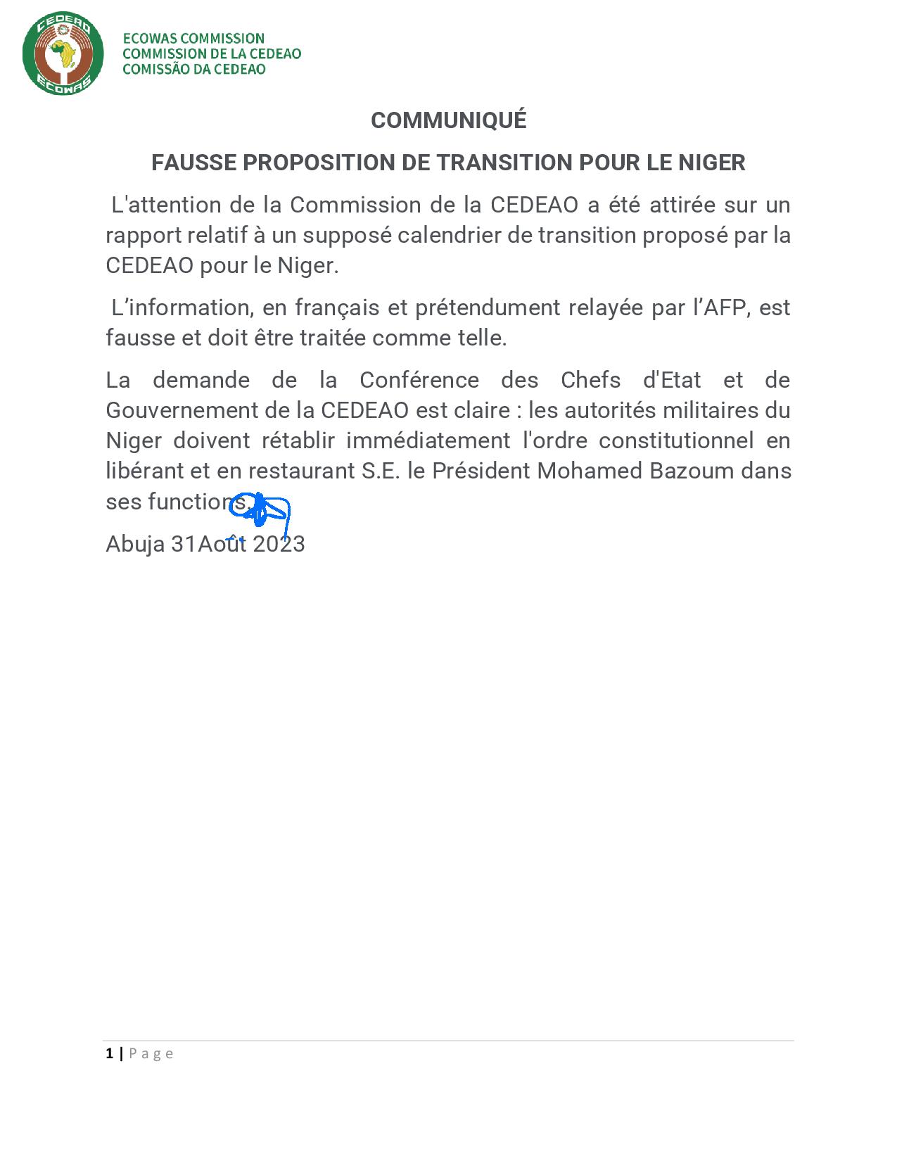 HomeAfriqueLa CEDEAO soutient qu’elle n’a pas proposée un calendrier pour la transition au NigerAfrique La CEDEAO soutient qu’elle n’a pas proposée un calendrier pour la transition au Niger By salimatou Barry Last updated Sep 1, 2023 0 Partager C’est à travers un communiqué que la CEDEAO nie avoir proposée un calendrier pour une transition à la junte militaire au Niger… Related Posts La CEDEAO et l’union africaine se prononcent sur la situation en… Nov 26, 2025 Coup d’État en cours en Guinée-Bissau : le président Sissoco Embaló… Nov 26, 2025 CEDEAONigertransition 0 Partager FacebookTwitterGoogle+ReddItWhatsAppPinterestCourriel