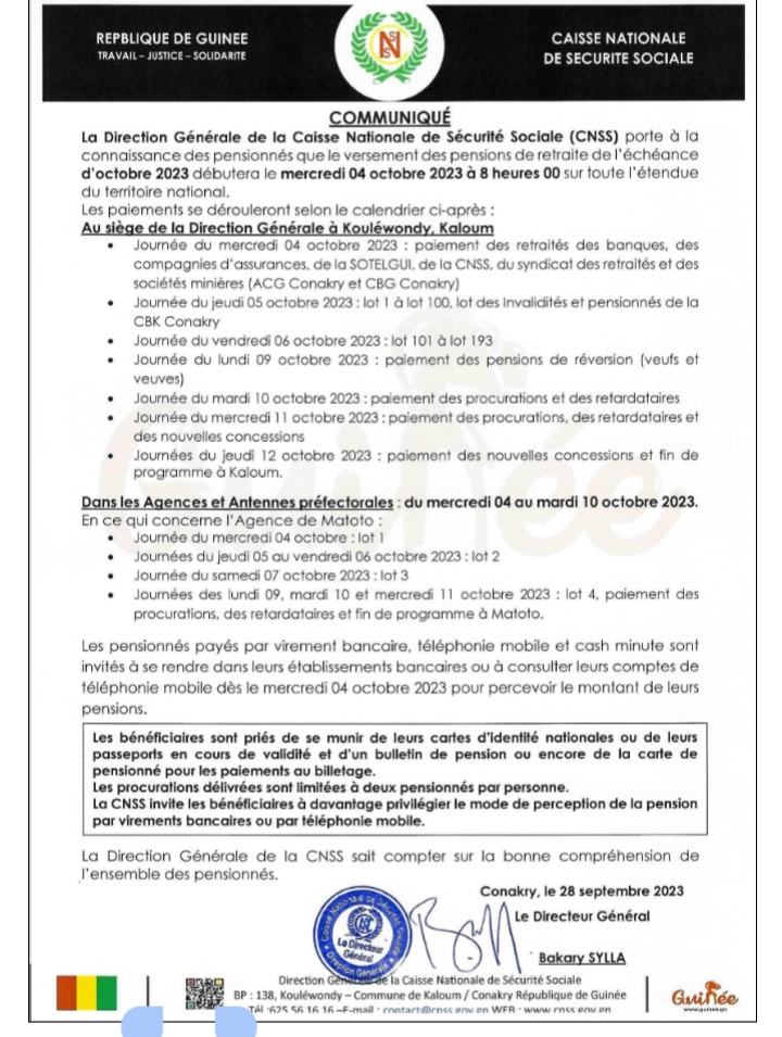 HomesociétéLa CNSS annonce le versement des pensions de retraite à partir du 4 octobre prochainsociété La CNSS annonce le versement des pensions de retraite à partir du 4 octobre prochain By salimatou Barry Last updated Sep 29, 2023 0 Partager 0 Partager FacebookTwitterGoogle+ReddItWhatsAppPinterestCourriel