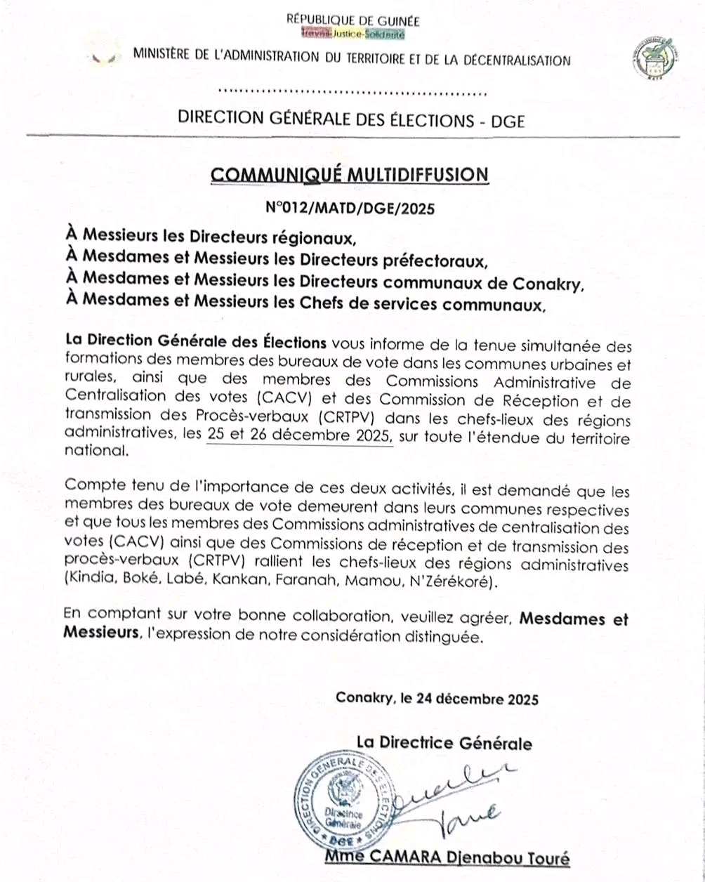 La Direction Générale des Élections vous informe de la tenue simultanée des formations des membres des bureaux de vote dans les communes urbaines et rurales, ainsi que des membres des Commissions Administrative de Centralisation des votes (CACV) et des Commission de Réception et de transmission des Procès-verbaux (CRTPV) dans les chefs-lieux des régions administratives, les 25 et 26 décembre 2025, sur toute l’étendue du territoire national.