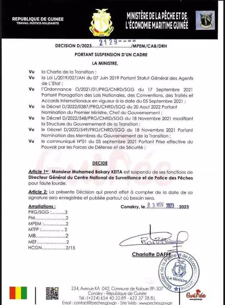 La ministre de la pêche et de l’économie numérique, Charlotte Daffé a suspendu son directeur général du Centre National de Surveillance et de Police des Pêches (CNSP) Mohamed Bakary Keïta.
