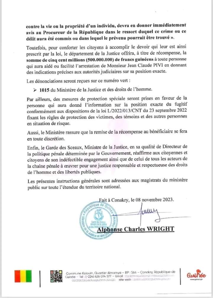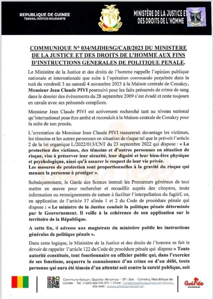 Le Colonel Claude Pivi est toujours en cavale depuis son « évasion » à la maison centrale de Conakry le 4 septembre dernier à l’Aube. Pour le traquer le ministère de la justice et des droits de l’homme promis 500 millions GNF à toute personne qui va contribuer.