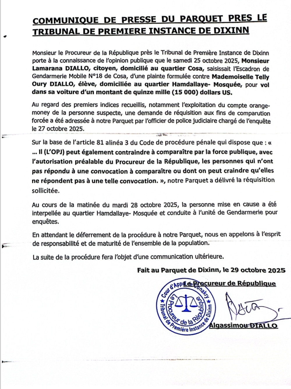 Le parquet du tribunal de première instance de Dixinn a apporté des précisions sur l’arrestation de la jeune fille Telly Oury Diallo. Selon le communiqué signé du procureur de la République près le TPI de Dixinn Algassimou Diallo, la fille a été arrêté pour un présumé cas de vol de 15 000 dollars…