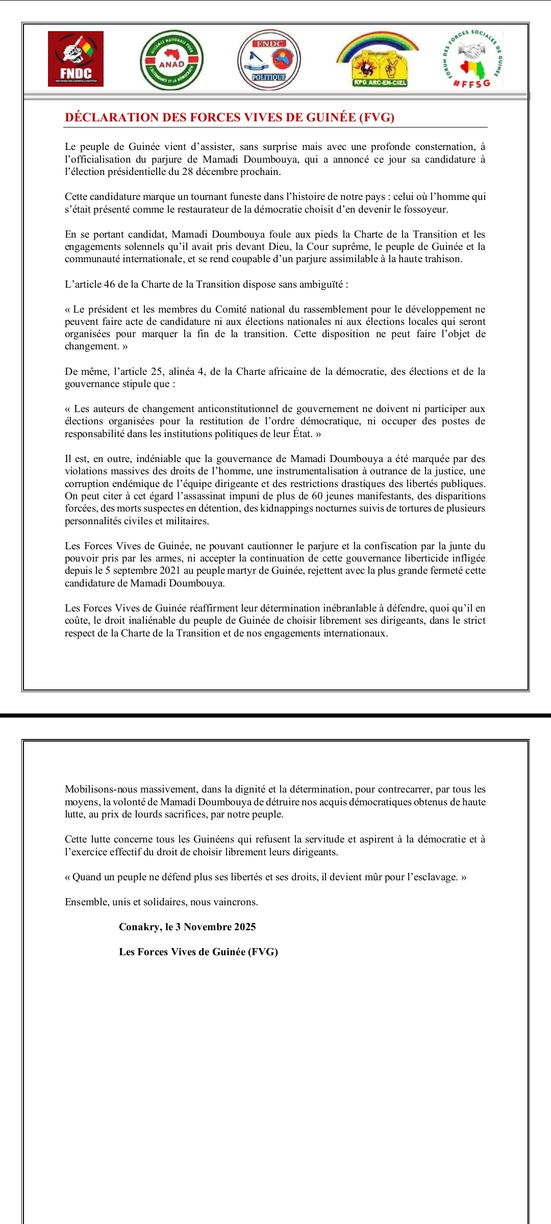 “Les Forces Vives de Guinée, ne pouvant cautionner le parjure et la confiscation par la junte du pouvoir pris par les armes, ni accepter la continuation de cette gouvernance liberticide infligée depuis le 5 septembre 2021 au peuple martyr de Guinée, rejettent avec la plus grande fermeté cette candidature de Mamadi Doumbouya”, lit-on dans la déclaration des forces vives que nous vous proposons ci-dessous.