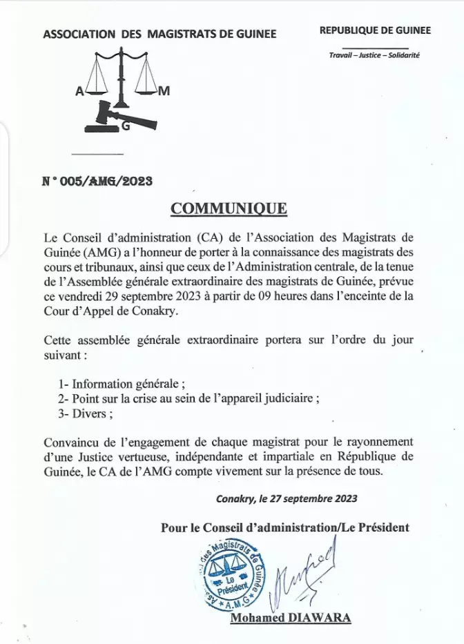 COMMUNIQUE- Le Conseil d’administration (CA) de l’Association des Magistrats de Guinée (AMG) a l’honneur de porter à la connaissance des magistrats des cours et tribunaux, ainsi que ceux de l’Administration centrale, de la tenue de l’Assemblée générale extraordinaire des magistrats de Guinée, prévue ce vendredi 29 septembre 2023 à partir de 09 heures dans l’enceinte de la Cour d’Appel de Conakry.