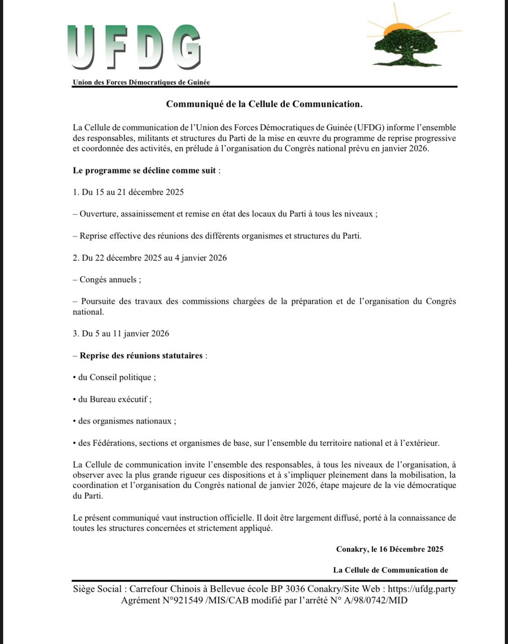 L’Union des forces démocratiques de Guinée (UFDG) a dévoilé son plan de reprise progressive des activités du parti après trois mois de suspension. Selon le communiqué du parti, cette reprise est consacrée aux préparatifs du congrès prévu courant janvier 2026.
