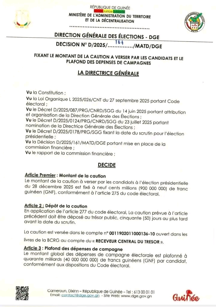 La Direction générale des élections a rendu publique la caution exigée pour les candidats à l’élection présidentielle prévue le 28 décembre 2025. Conformément à l’article 275 du Code électoral, ce montant est fixé à 900 millions de francs guinéens (GNF).