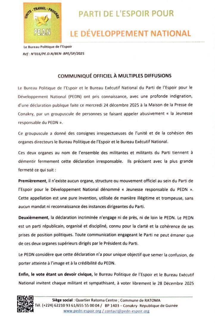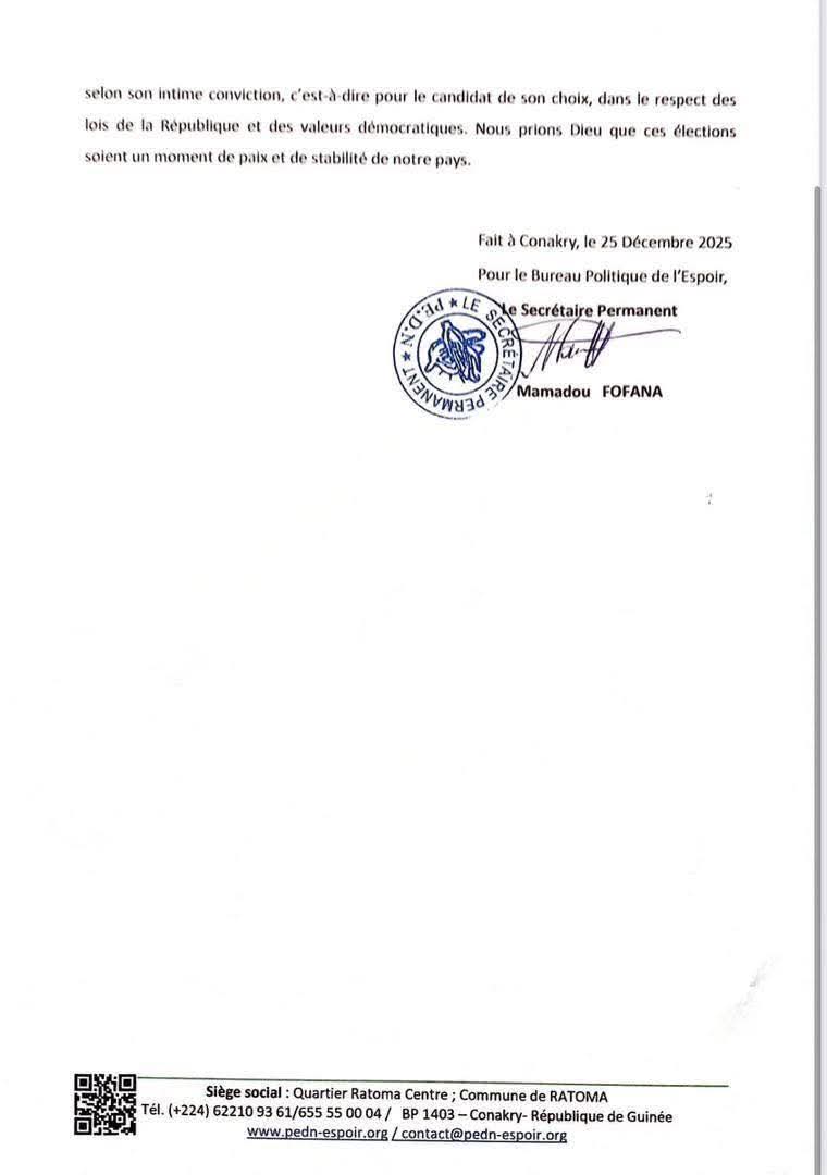 “Le vote étant un devoir civique, le Bureau Politique de l’Espoir et le Bureau Exécutif National invitent chaque militant et sympathisant, à voter librement le 28 Décembre 2025 selon son intime conviction, c’est-à-dire pour le candidat de son choix, dans le respect des lois de la République et des valeurs démocratiques. Nous prions Dieu que ces élections soient un moment de paix et de stabilité de notre pays”, lit-on dans un communiqué officiel du parti.