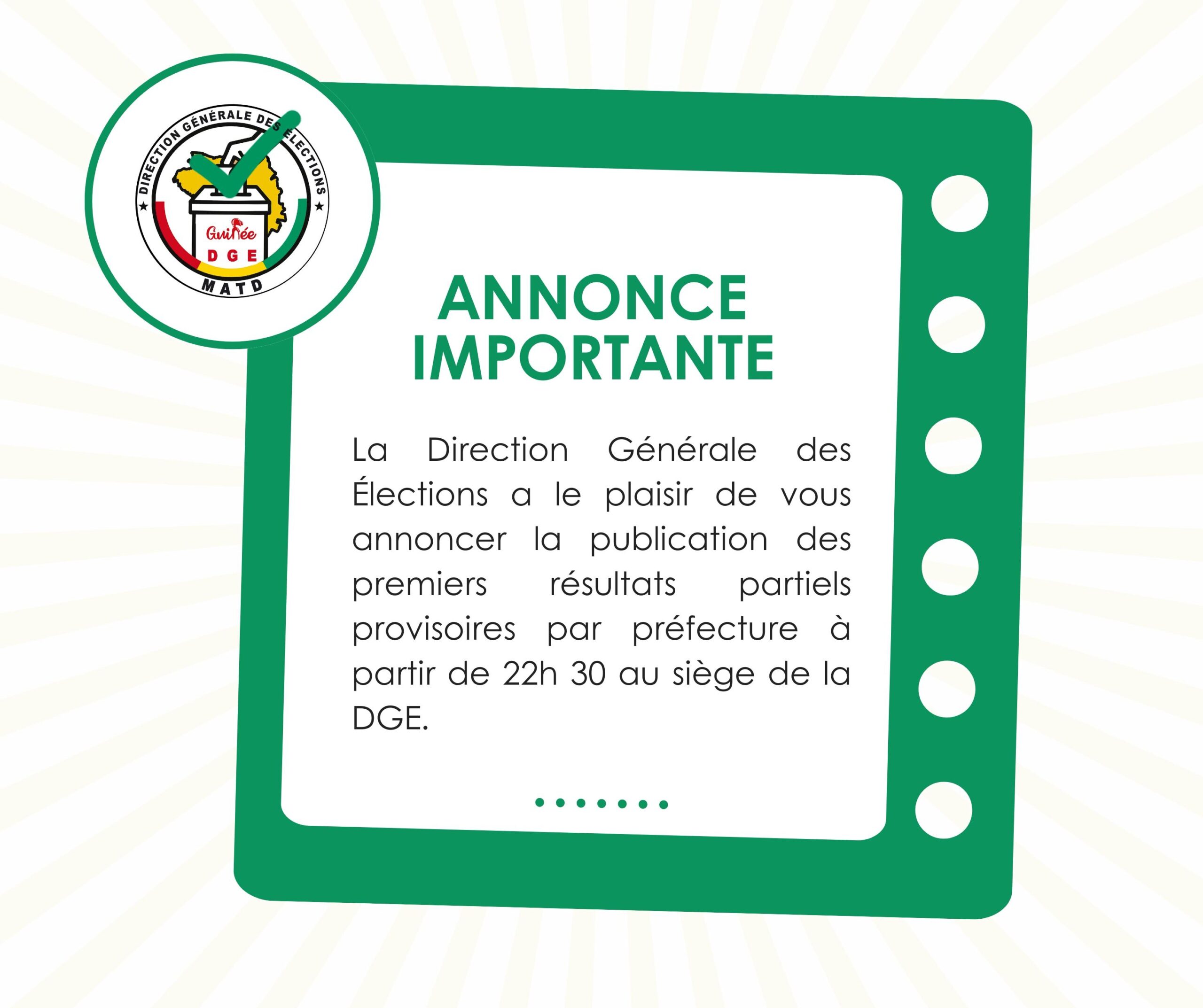 HomeActualitésPrésidentielle 2025: les premiers résultats disposition à partir de 22h 30 Actualitéspolitique Présidentielle 2025: les premiers résultats disposition à partir de 22h 30 By salimatou Barry On Déc 29, 2025 0 Partager La Direction Générale des Élections (DGE) annonce la publication des premiers résultats partiels provisoires par préfecture de l’élection présidentielle. Cette publication se fera à partir de 22h 30 au siège de la DGE. Related Posts Présidentielle du 28 décembre : le Bloc Libéral dénonce de graves… Déc 29, 2025 Présidentielle 2025: les premiers résultats partiels attendus, ce… Déc 29, 2025 Guinéeprésidentielle 2025Présidentielle 2025: les premiers résultats disposition à partir de 22h 30résultats 0 Partager FacebookTwitterGoogle+ReddItWhatsAppPinterestCourriel