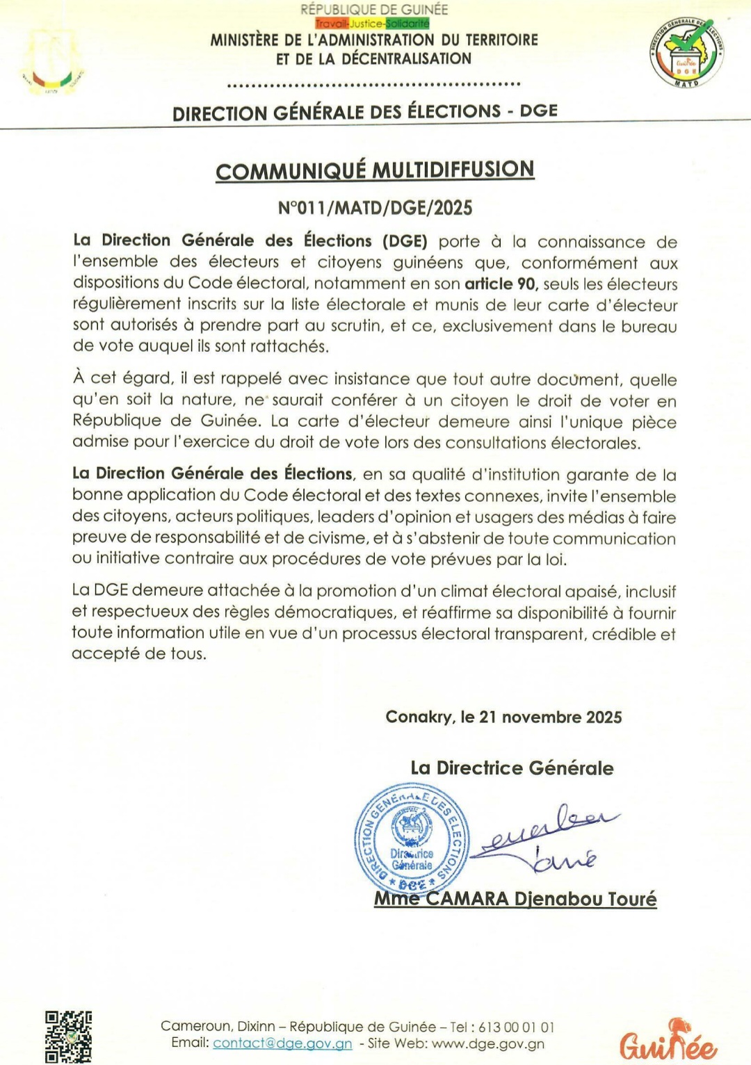 La Direction Générale des Élections (DGE) porte à la connaissance de l’ensemble des électeurs et citoyens guinéens que, conformément aux dispositions du Code électoral, notamment en son article 90, seuls les électeurs régulièrement inscrits sur la liste électorale et munis de leur carte d’électeur sont autorisés à prendre part au scrutin, et ce, exclusivement dans le bureau de vote auquel ils sont rattachés.