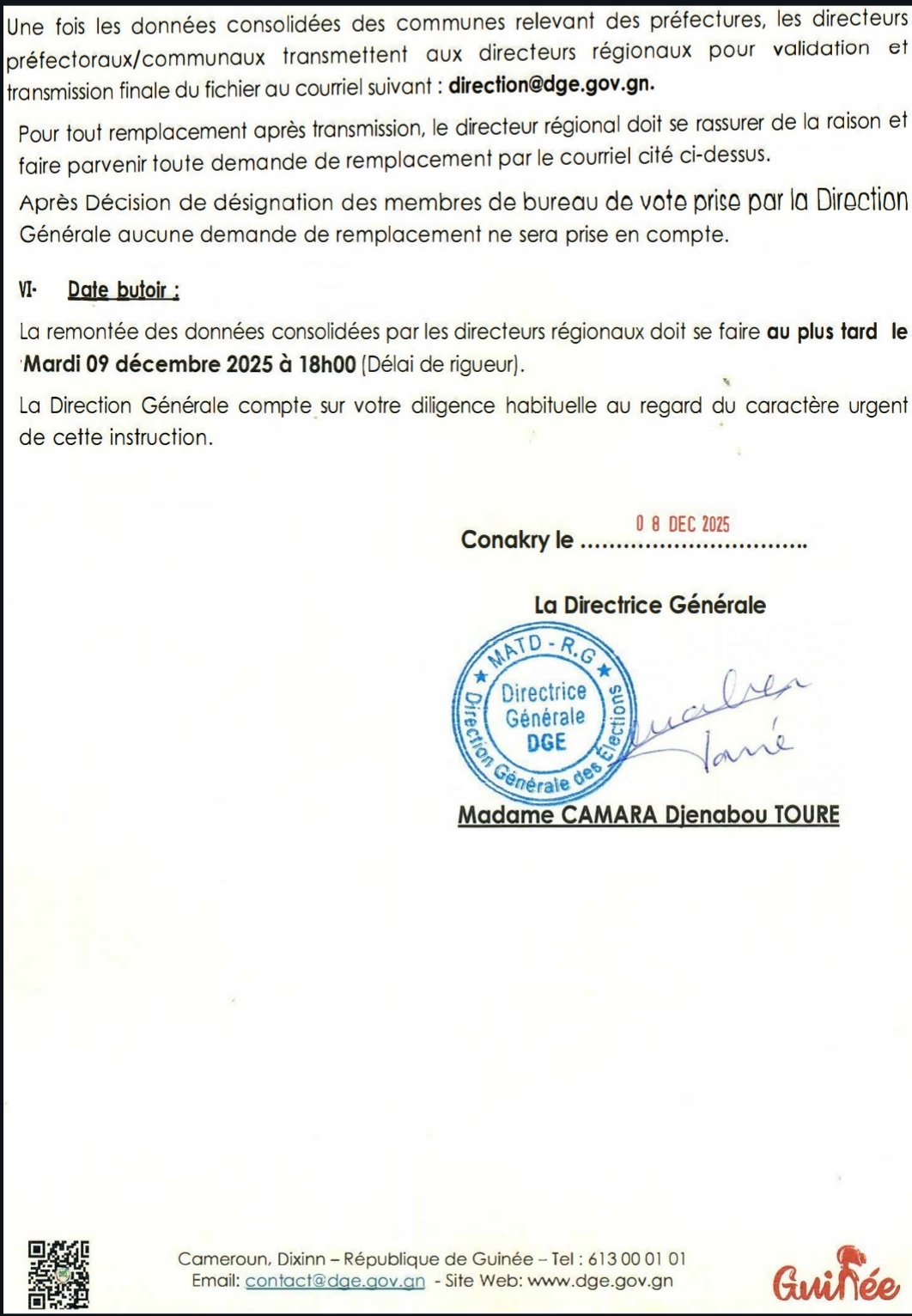 La directive relative à la désignation des membres des bureaux de vote dans le cadre de l’élection présidentielle prévue le 28 décembre 2025 a été publiée par la direction générale des élections (DGE). Dans le document, il est précisé que chaque bureau de vote sera composé de cinq membres ( un président, un vice-président, un secrétaire et deux assesseurs, conformément au Code électoral). Ci-dessous la note directive.