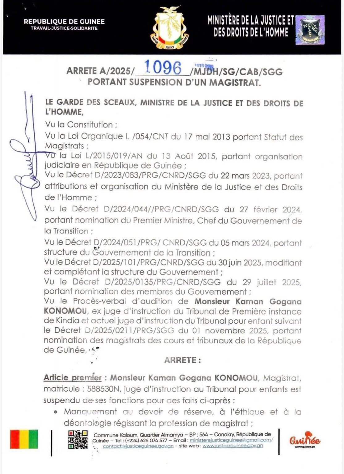 Un magistrat a été suspendu de ses fonctions, ce jeudi 13 novembre 2025 en Guinée. Il s’agit de Kaman Gogana Konomou, matricule 588530N, juge d’instruction au Tribunal pour enfants.