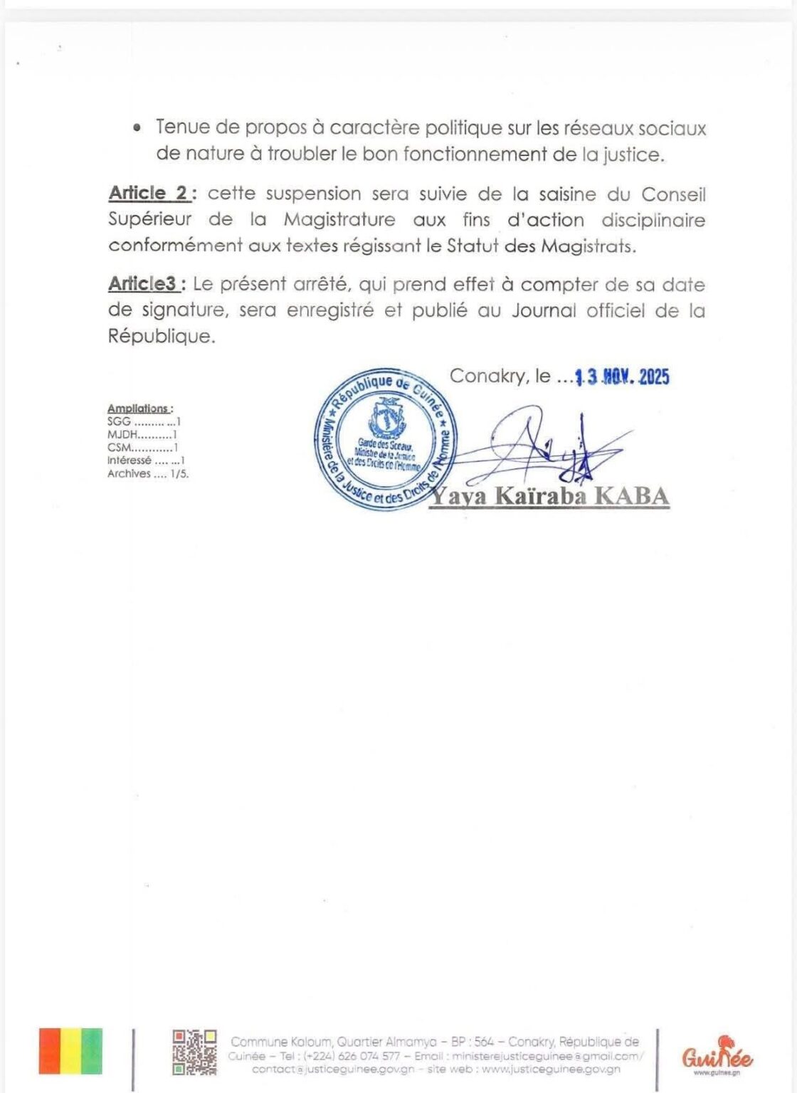 Il est suspendu par le garde des Sceaux, ministre de la Justice et des Droits de l’Homme, Yaya Kaïraba Kaba à travers un arrêté. La chancellerie l’accuse de: “ Manquement au devoir de réserve, à l’éthique et à la déontologie régissant la profession de magistrat ; Tenue de propos à caractère politique sur les réseaux sociaux, susceptibles de troubler le bon fonctionnement du service public de la justice”.