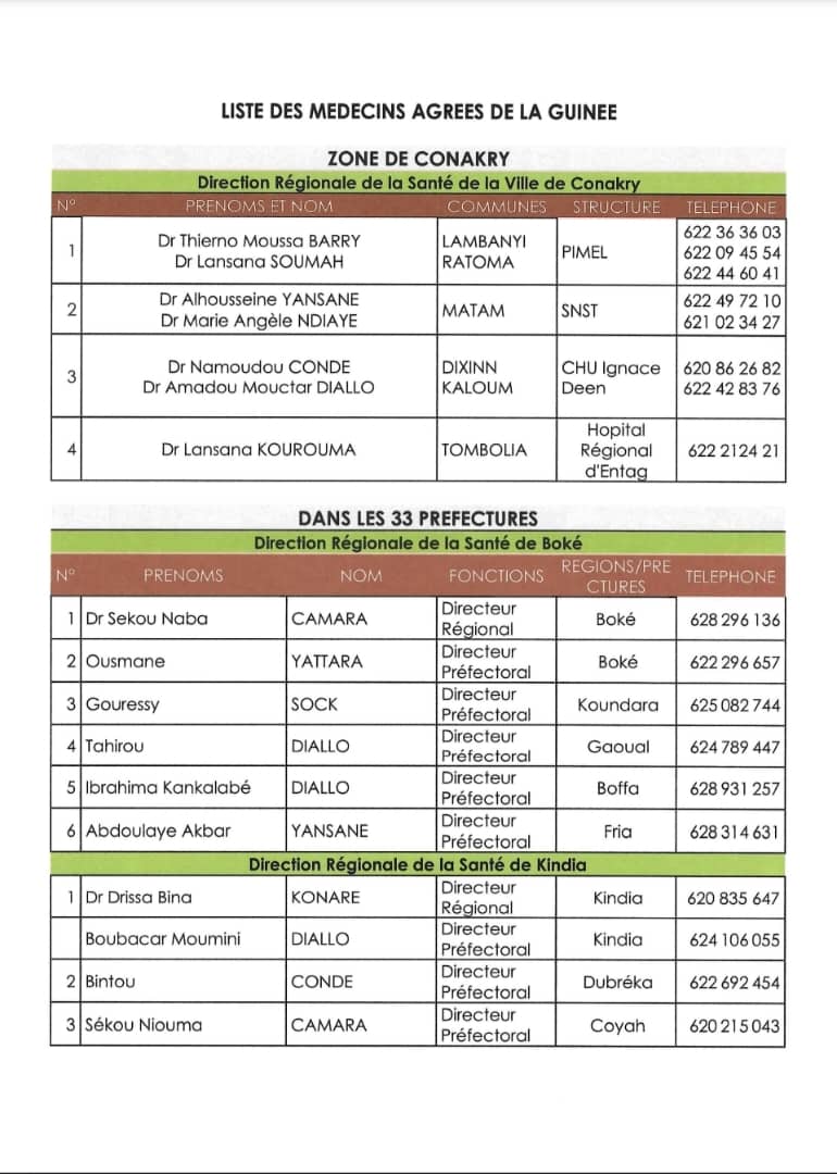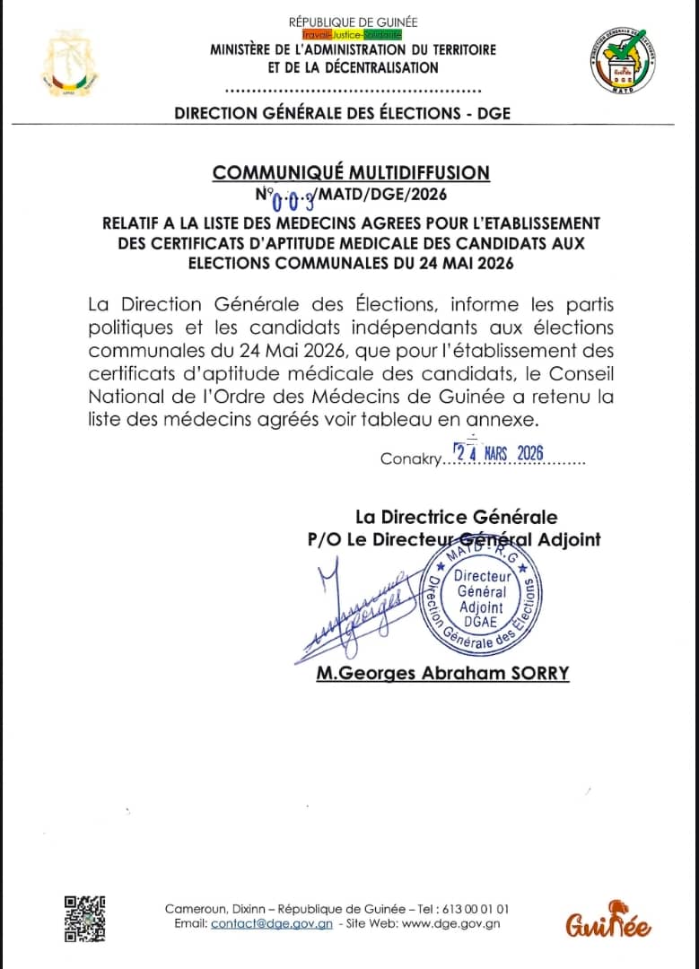 La Direction Générale des Élections (DGE) a publié la liste des médecins qui doivent examiner les différents candidats du double scrutin du 24 mai 2026. Dans le communiqué publié, mardi 24 mars 2026, la DGE précise que cette liste a été établie par le Conseil National de l’Ordre des Médecins de Guinée. Ci-dessous la liste.