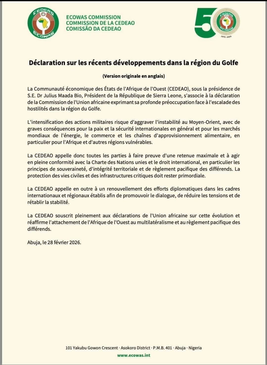 La Communauté économique des États de l’Afrique de l’Ouest (CEDEAO), s’associe à la déclaration de la Commission de l’Union africaine pour exprimer sa profonde préoccupation face à l’escalade des hostilités dans la région du Golfe. Elle appelle donc toutes les parties à faire preuve d’une retenue maximale et à agir en pleine conformité avec la Charte des Nations unies et le droit international, en particulier les principes de souveraineté, d’intégrité territoriale et de règlement pacifique des différends. La protection des vies civiles et des infrastructures critiques doit rester primordiale.