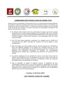 Après avoir pris connaissance, hier tard dans la nuit, du communiqué de presse publié par la Primature invitant les membres des Forces Vives de Guinée (FVG) à une réunion à la Primature ce mardi 28 février 2023 à 13 heures, les acteurs politiques et de la Société Civile concernés ont procédé à la lecture commune du communiqué de presse et ont abouti aux conclusions ci après: